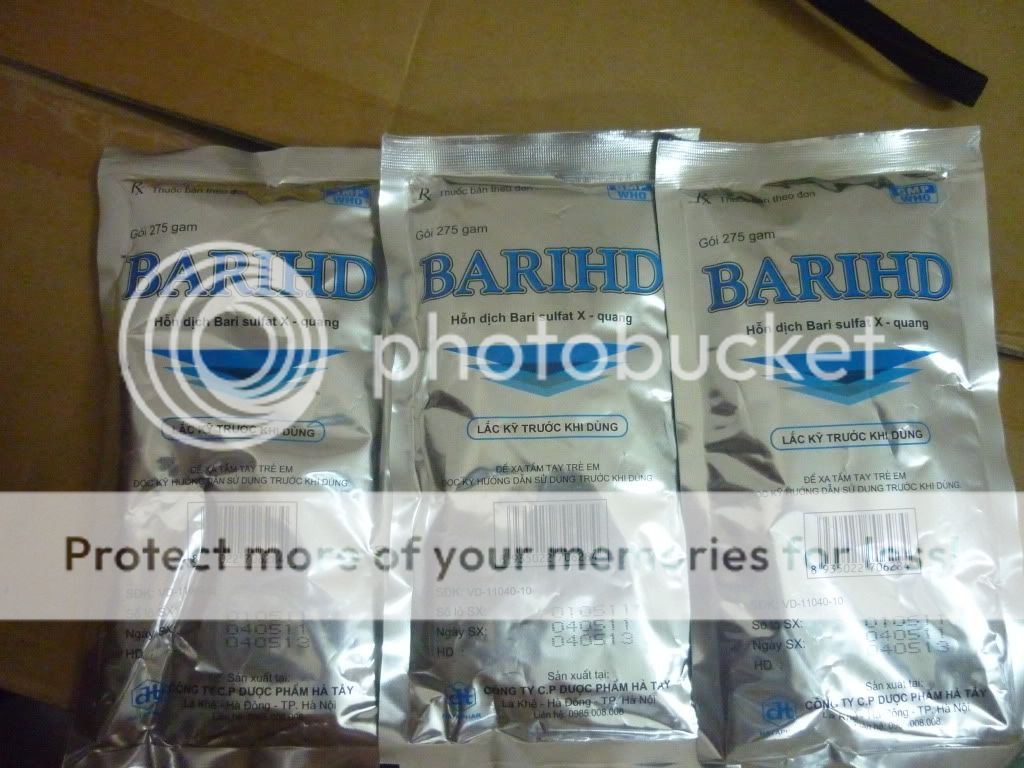 -BariHD, có barisulfat dùng chụp dạ dày tá tràng, có hai dạng là túi 275 ml và chai 550 ml.